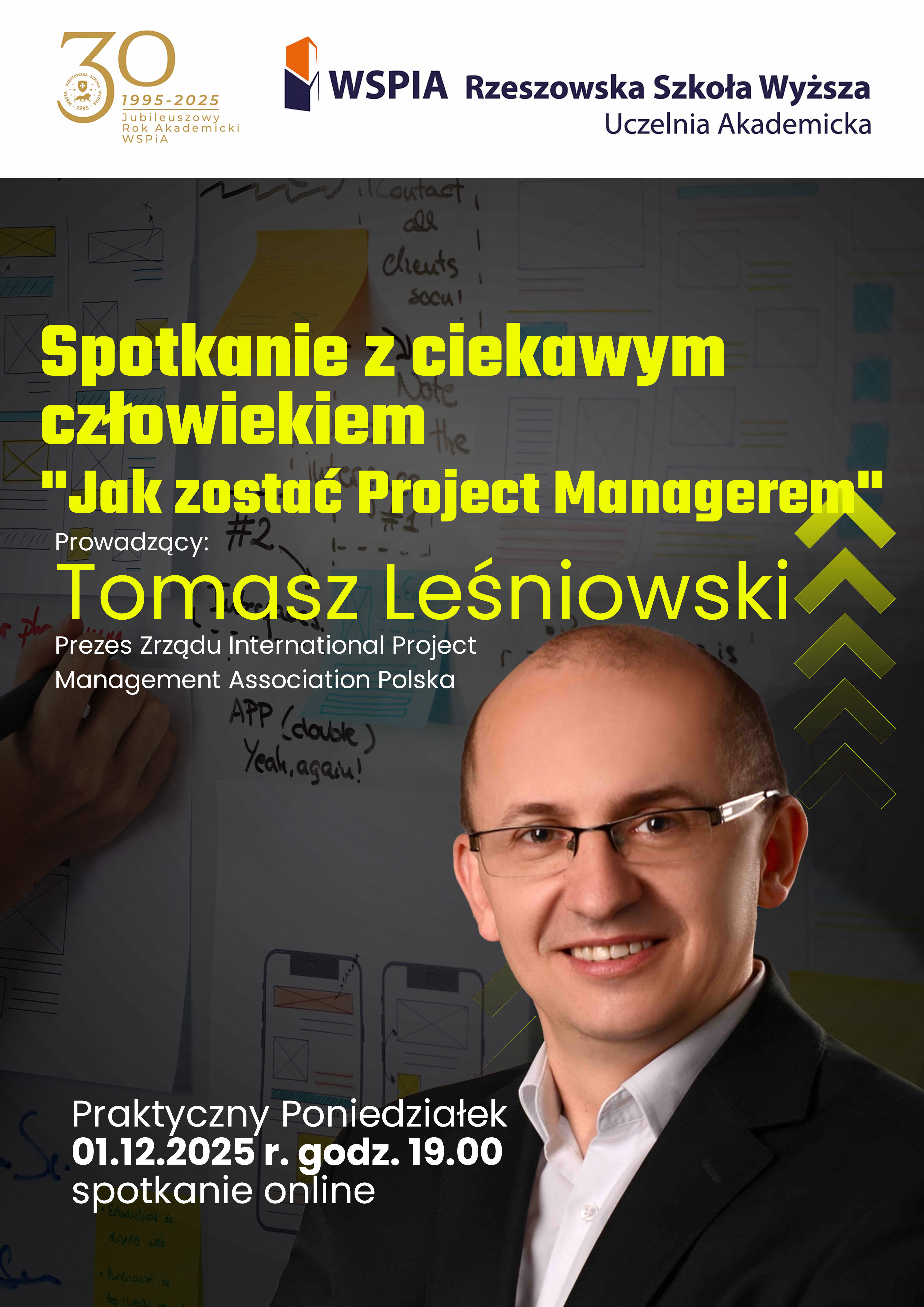 - Spotkanie z ciekawym człowiekiem Pan Tomasz Leśniowski - Prezes Zrządu International Project Management Association Polska- który poprawadzi wykład otwarty pt.: "Jak zostać Project Managerem". Podczas webinaru zostaną przedstawione główne pojęcia związane z realizacją projektów oraz pierwszych kroków do zostania Kierownikiem Projektu. Przybliżone zostaną także główne role projektowe. Wykład organizowany przez CKKPiED. Godzina 19:00, forma online. Link: Spotkanie z ciekawym człowiekiem Pan Tomasz Leśniowski - Prezes Zrządu International Project Management Association Polska | Dołączanie do spotkania | Microsoft Teams