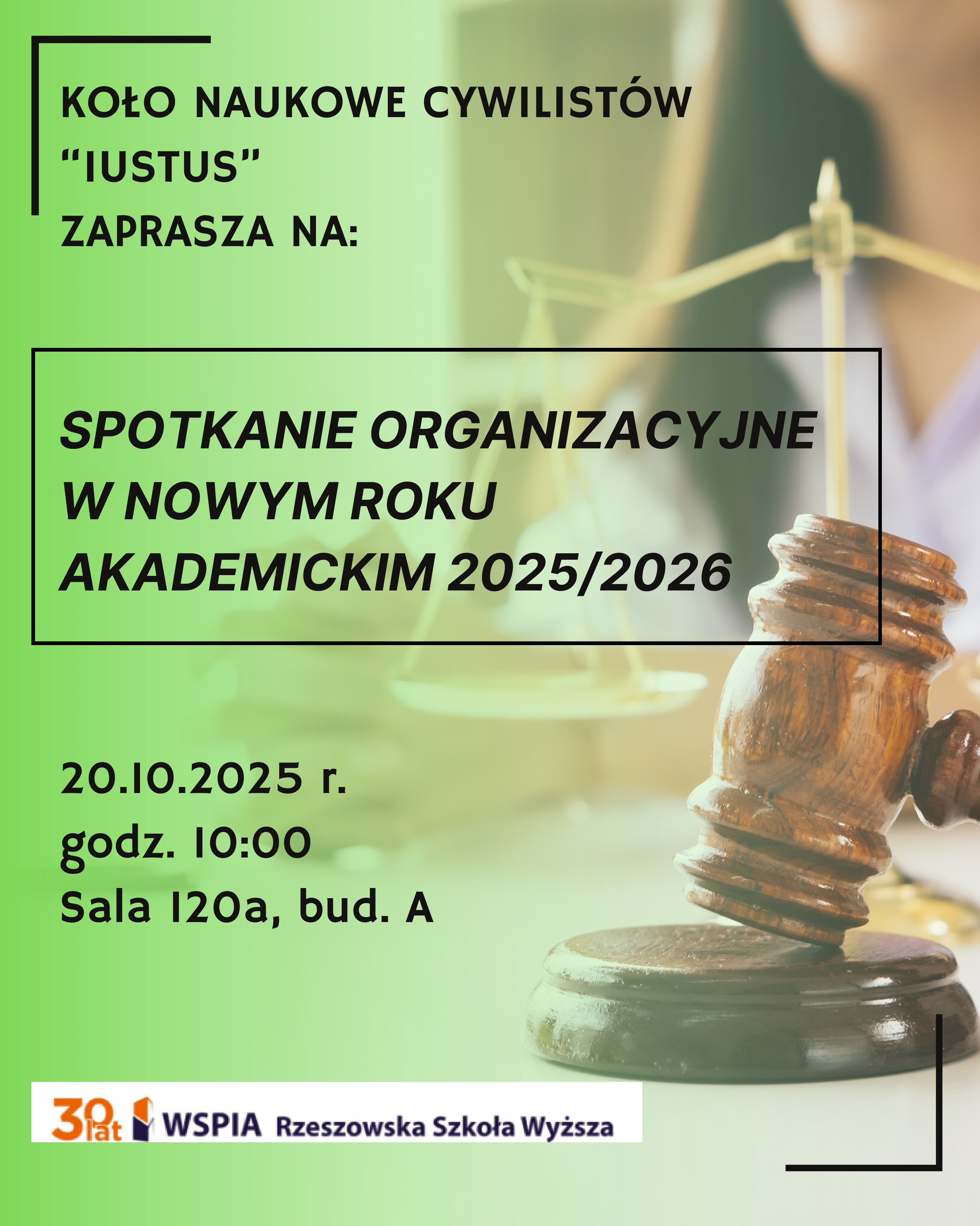 - Spotkanie organizacyjne Koła Naukowego Cywilistów ,,IUSTUS". Godzina 10:00, Sala: 120a.