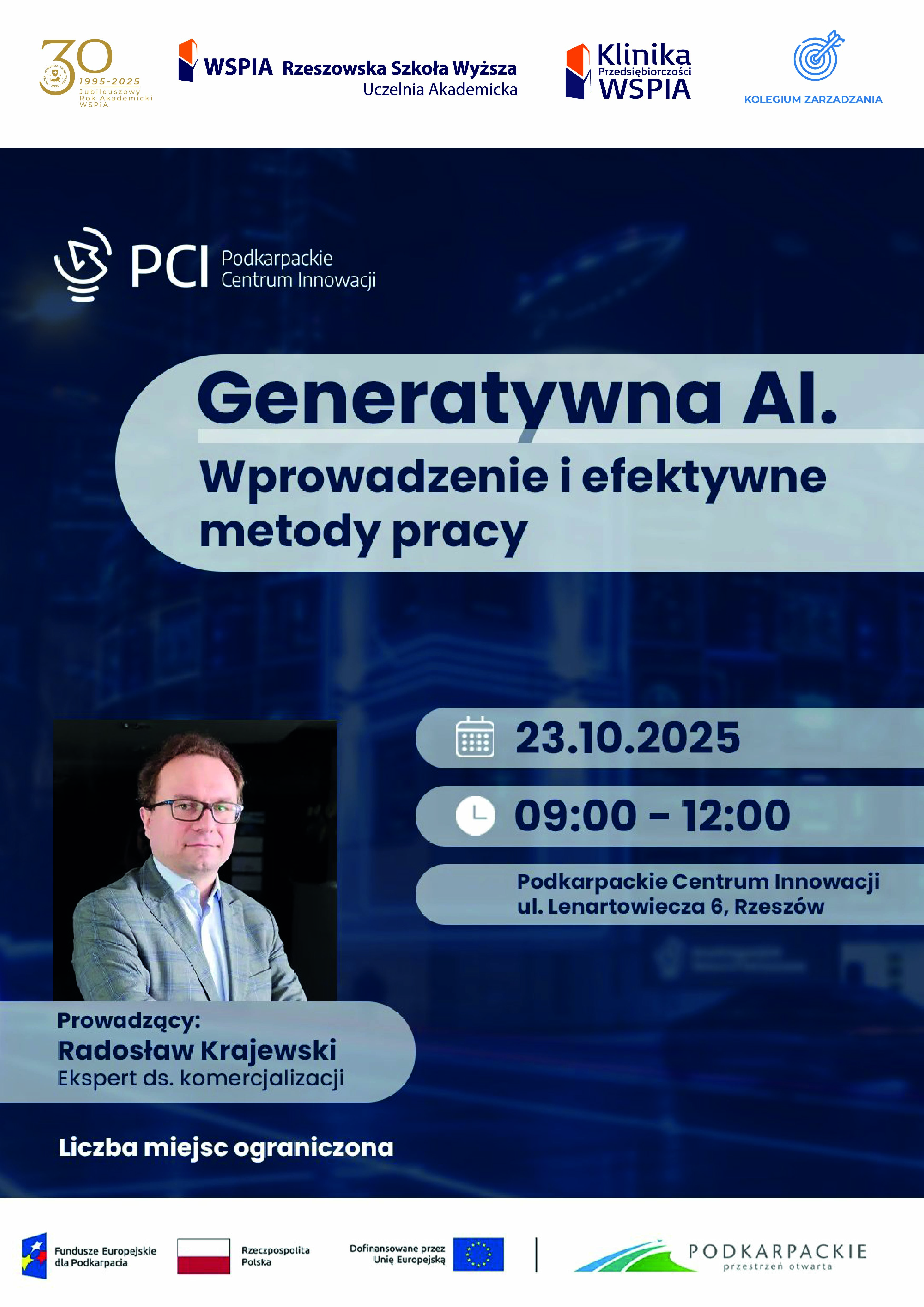 - W dniu 23 października w godzinach 23 października Klinika Przedsiębiorczości zaprasza na warsztaty pt.: "Generatywna AI. Wprowadzenie i efektywne metody pracy” organizowane przez Podkarpackie Centrum Innowacji w siedzibie PCI przy ulicy Lenartowicza 4. Wymagana wcześniejsza rejestracja. Pod dokonaniu zgłoszenia do udziału w warsztatach prosimy przesłać wiadomość potwierdzającą na adres klinika.przedsiebiorczosci@wspia.eu