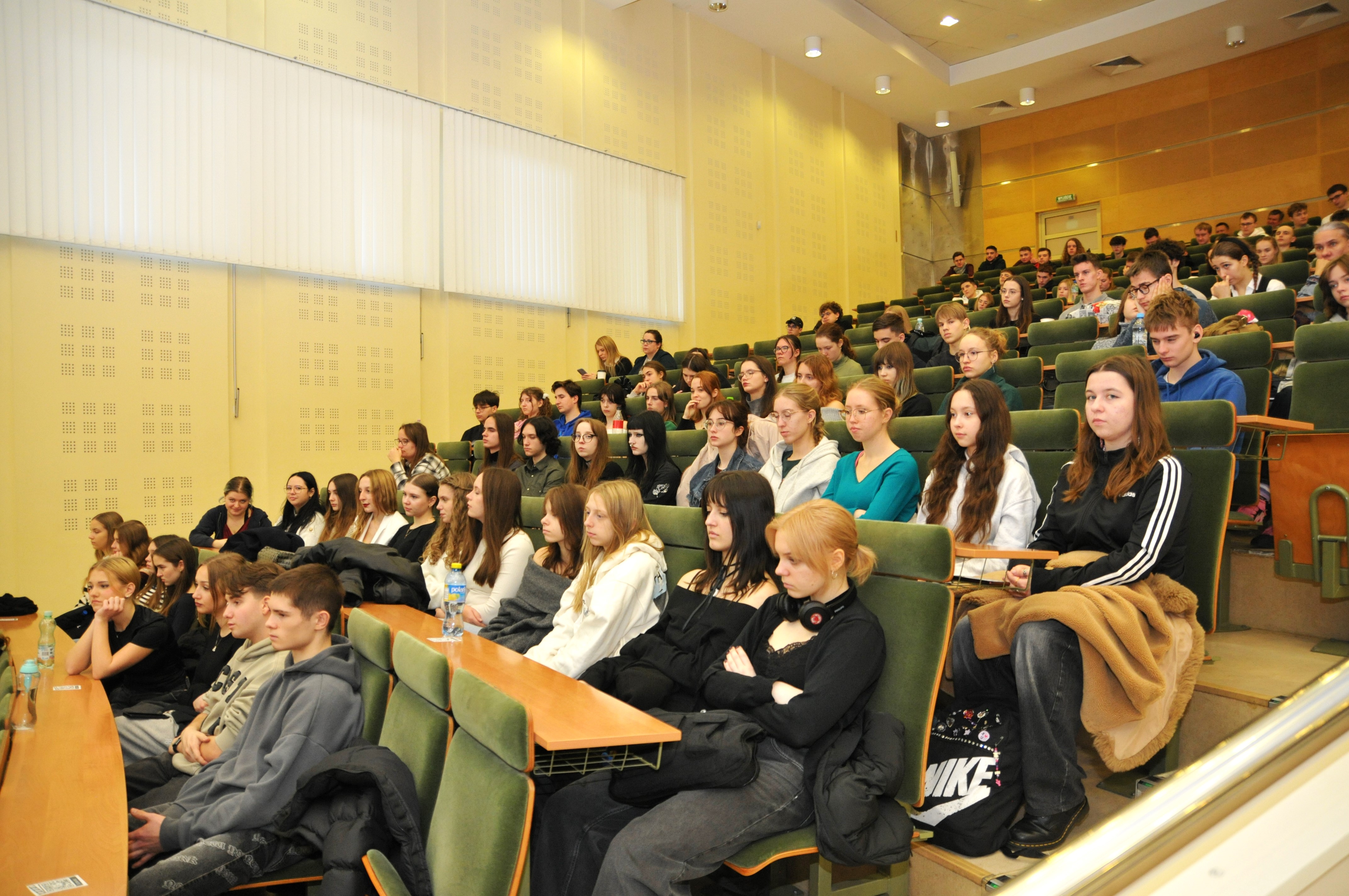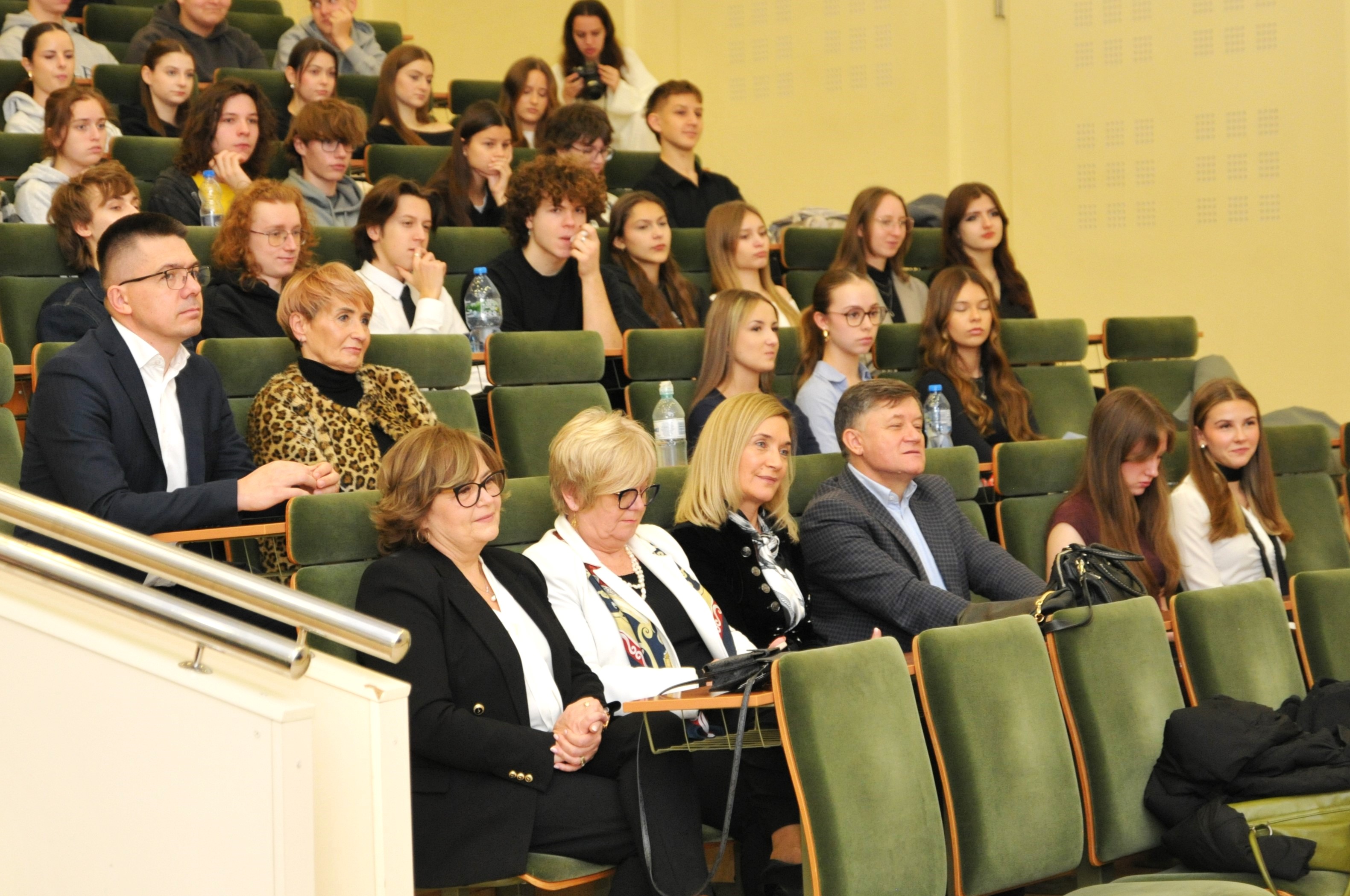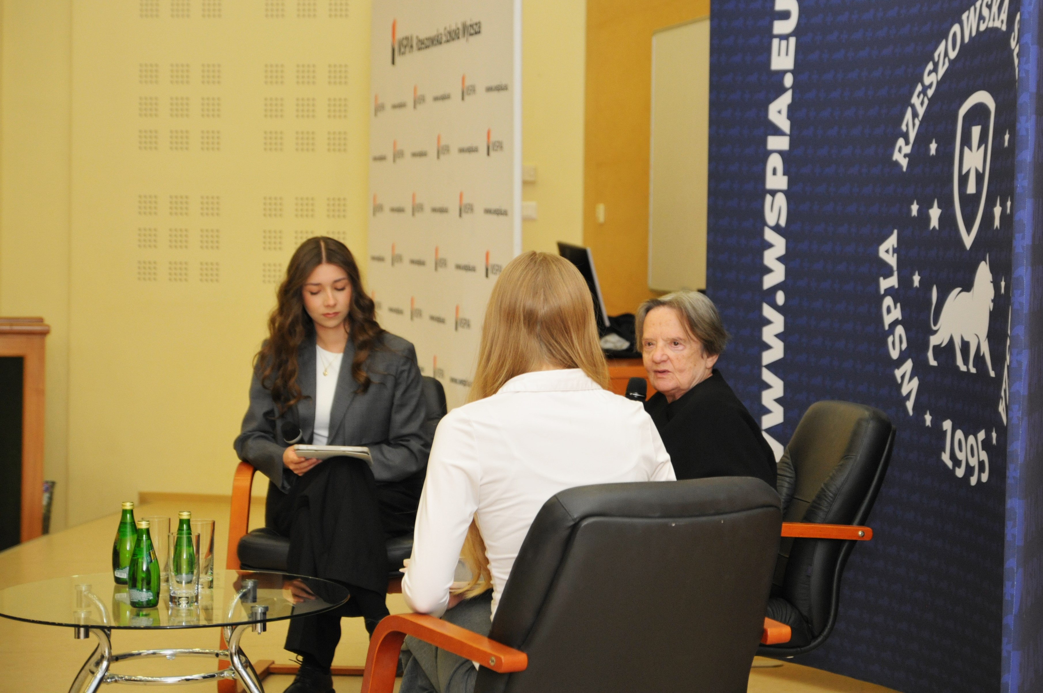 We wtorek, 26 listopada w Auli WSPiA Rzeszowskiej Szkoły Wyższej odbyło się kolejne wydarzenie z cyklu „Młode Myśli – Wielkie Rozmowy”. Projekt z inicjatywy pięciu uczennic z I Liceum Ogólnokształcącego w Rzeszowie, od lat współpracującego z WSPiA, stanowi przestrzeń, w której młodzież może rozwijać swoje umiejętności komunikacyjne i pogłębiać wiedzę na kluczowe tematy osobiste i zawodowe. Tym razem uczniowie rzeszowskich szkół ponadpodstawowych mieli wyjątkową okazję spotkać się z Agnieszką Holland, polską reżyserką filmową i teatralną, scenarzystką, aktorką i tłumaczką.