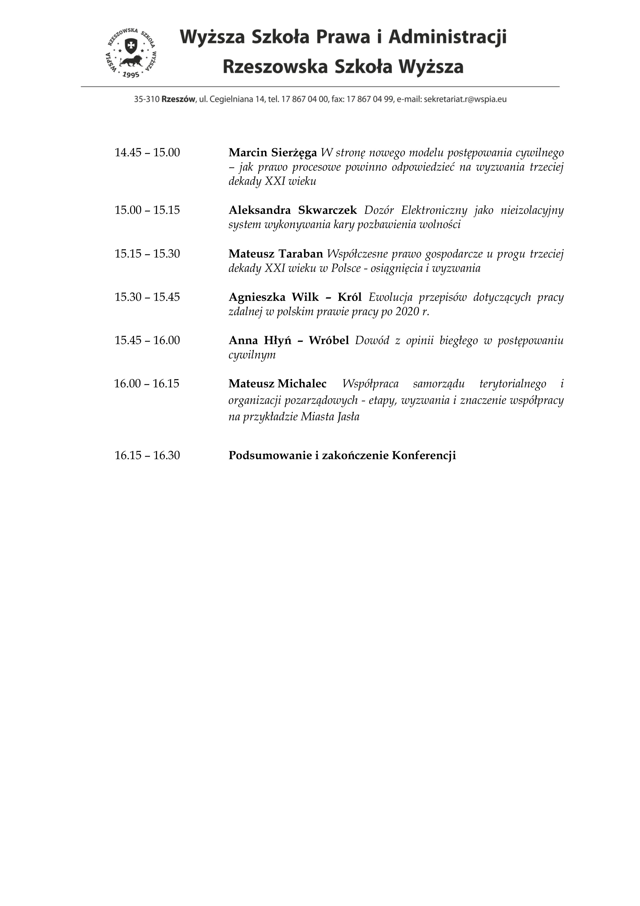 Konferencja zakończy się wspólnym podsumowaniem i dyskusją na temat wyzwań, jakie stoją przed prawem w dynamicznie zmieniającej się rzeczywistości społeczno-gospodarczej.
