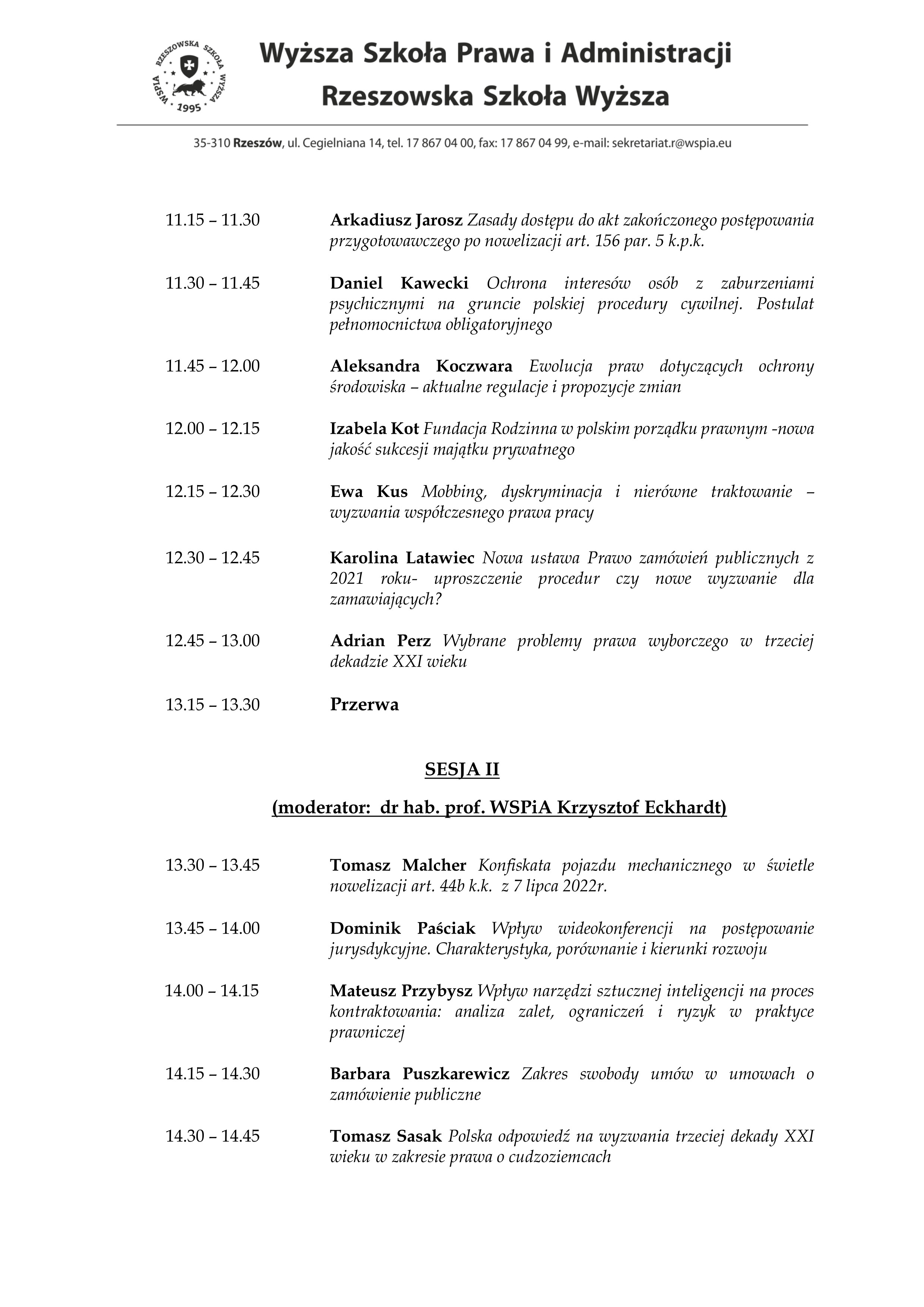 W programie przewidziano wystąpienia blisko 30 prelegentów. Podzielono je na dwie sesje, moderowane przez prof. Krzysztofa Eckhardta, Pełnomocnik Rektora WSPiA ds. Nauki. Wśród omawianych tematów znajdą się m.in.: penalny populizm a standardy państwa prawa, ochrona dóbr osobistych w Internecie, deinstytucjonalizacja usług społecznych, doręczenia elektroniczne w administracji, fundacja rodzinna jako nowa forma sukcesji majątkowej, konfiskata pojazdów mechanicznych na gruncie nowelizacji kodeksu karnego, wpływ sztucznej inteligencji na praktykę kontraktowania oraz ewolucja przepisów dotyczących pracy zdalnej.