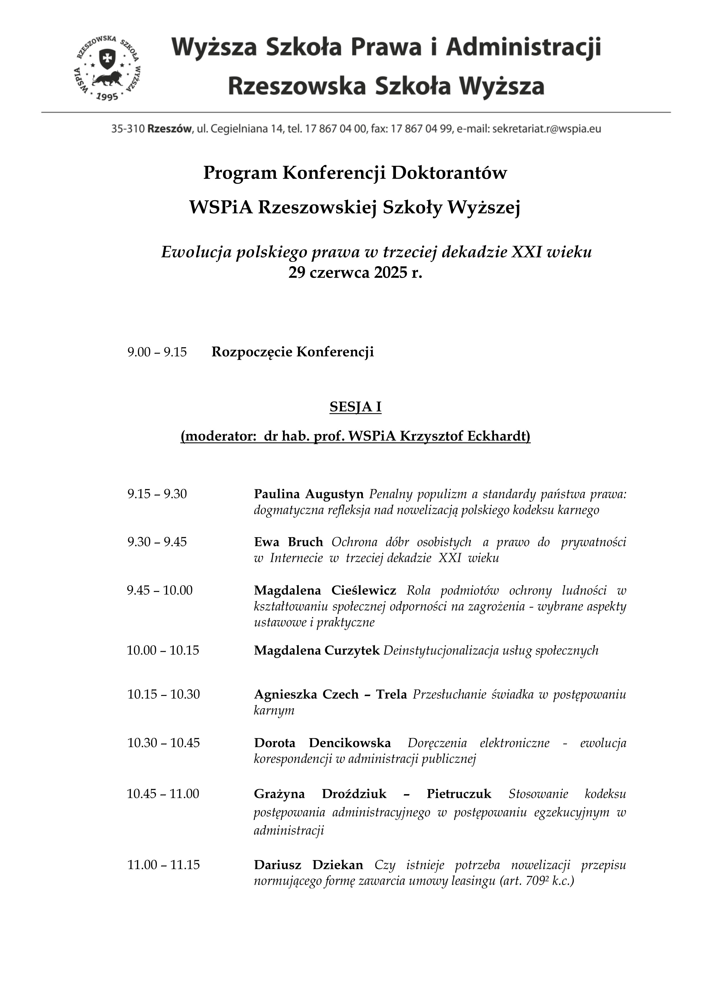 WSPiA Rzeszowska Szkoła Wyższa już po raz kolejny organizuje ogólnopolską Konferencję Doktorantów. Tegoroczne wydarzenie odbywa się pod hasłem „Ewolucja polskiego prawa w trzeciej dekadzie XXI wieku” i zgromadzi doktorantów I, II i III roku oraz absolwentów Seminarium Doktoranckiego w WSPiA.