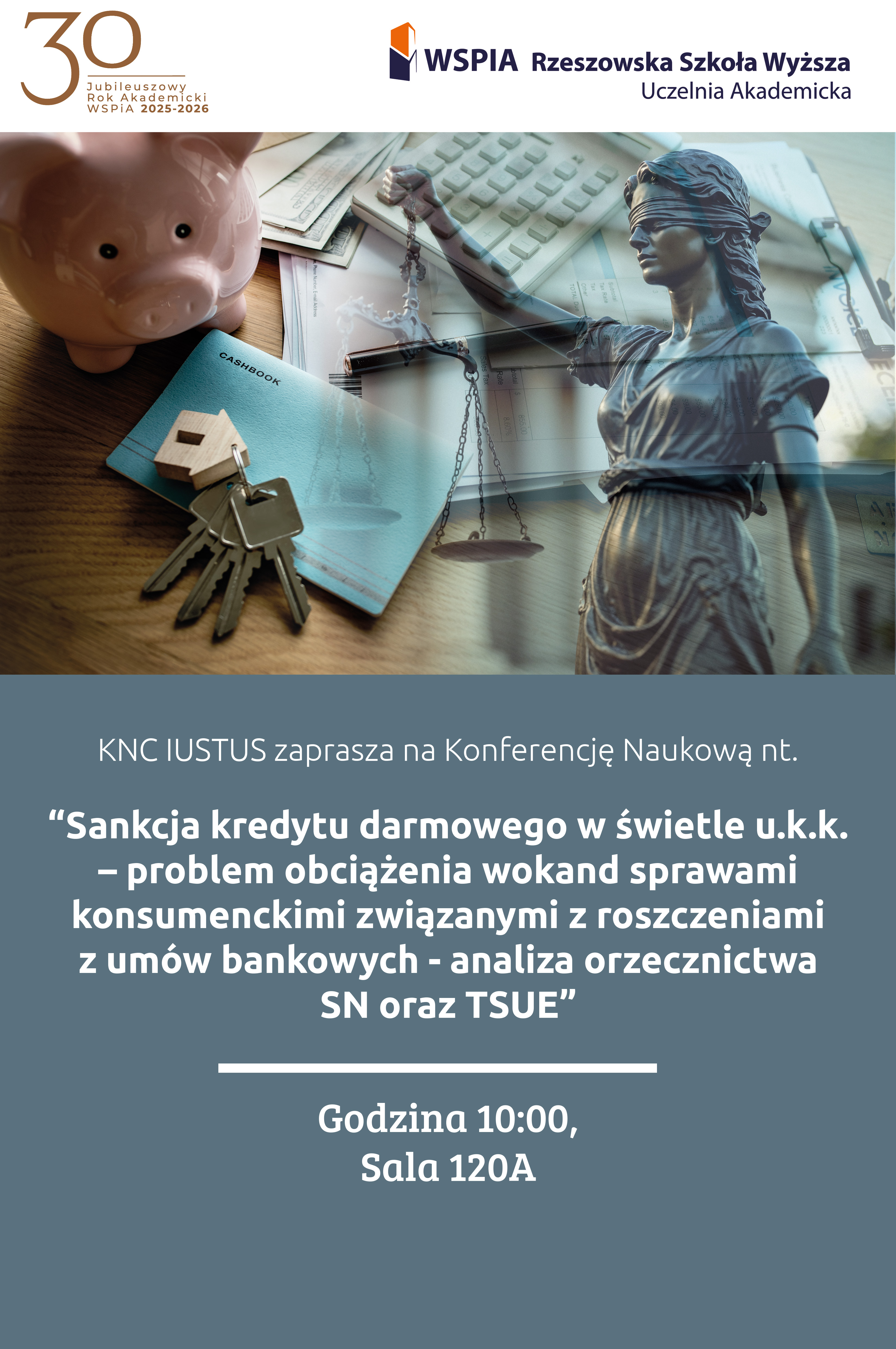 - 10:00 - Konferencja Naukowa "Sankcja kredytu darmowego w świetle u.k.k. – problem obciążenia wokand sprawami konsumenckimi związanymi z roszczeniami z umów bankowych - analiza orzecznictwa SN oraz TSUE" organizowana przez Koło Naukowe Cywilistów Iustus, Sala 120A.
