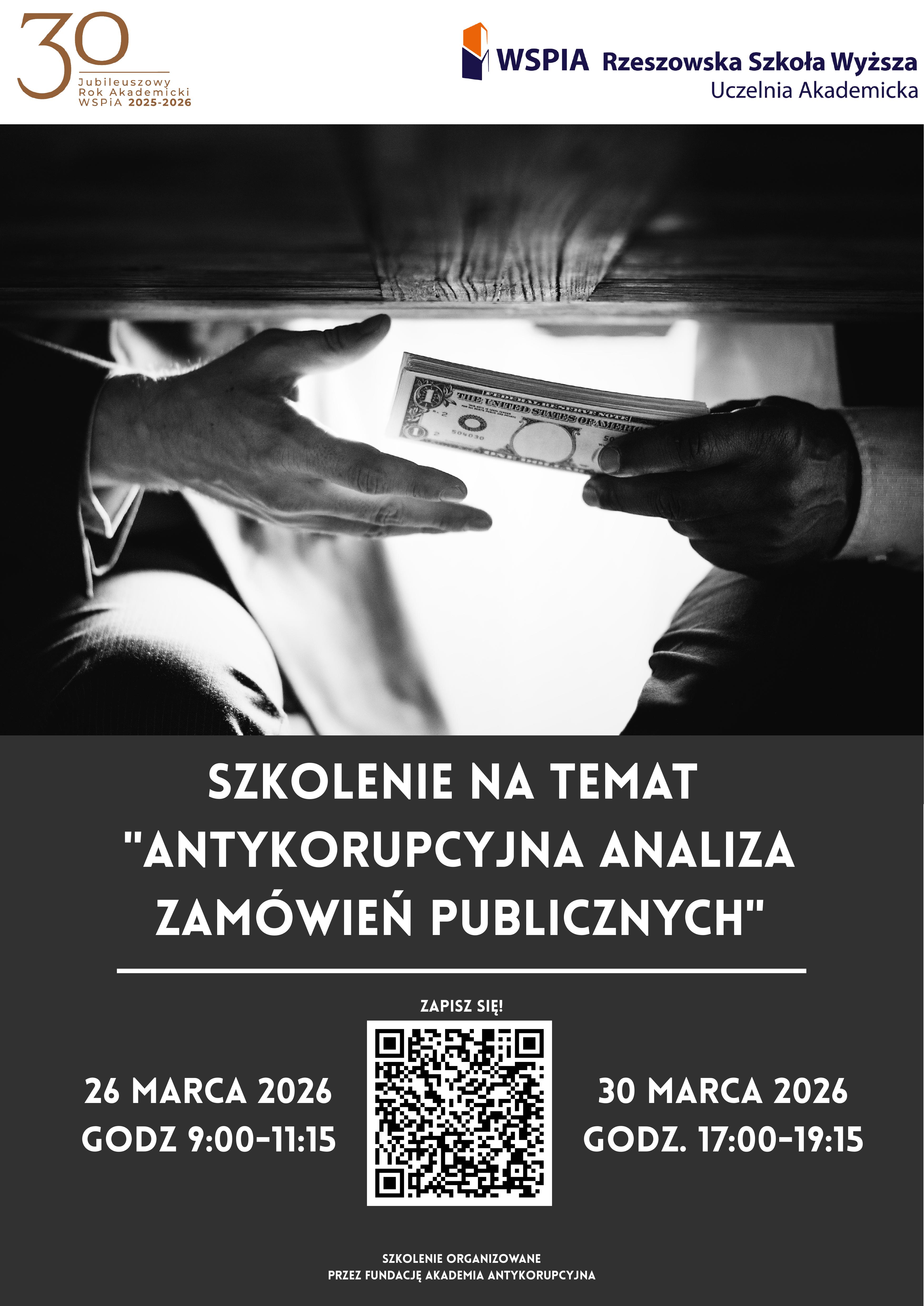 Jednocześnie Klinika Przedsiębiorczości WSPiA przypomina o możliwości wzięcia udziału w szkoleniu "Antykorupcyjna analiza zamówień publicznych", organizowanym przez Fundację Akademia Antykorupcyjna. Szkolenie online odbędzie się w dwóch terminach: 26 marca 2026 r. w godzinach 9:00-11:15 lub alternatywnie 30 marca 2026 r. w godzinach 17:00-19:15. Przed udziałem należy zarejestrować się przy użyciu maila uczelnianego poprzez link: https://forms.gle/mDvbUxsfKMQPLqwTA