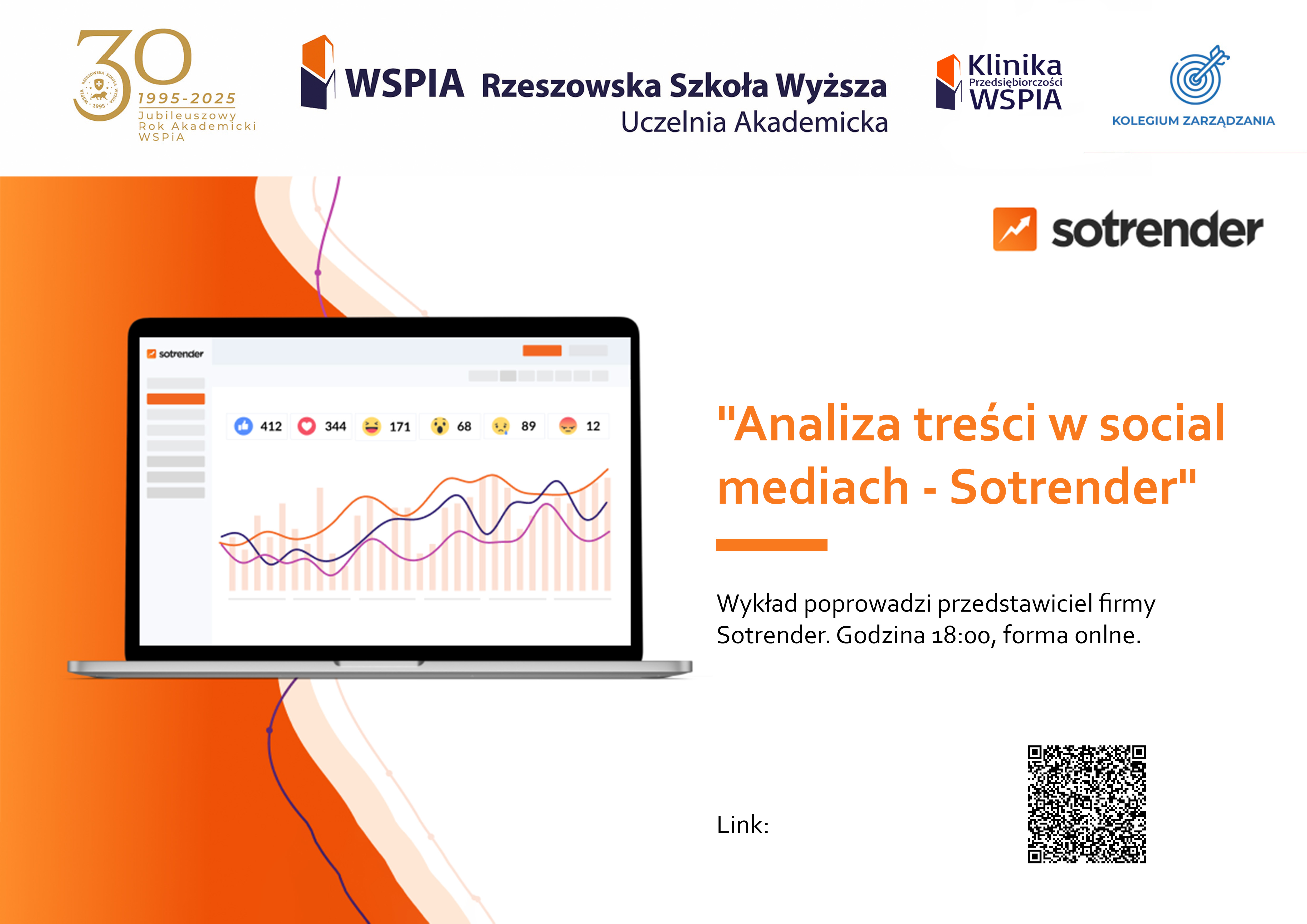 18:00 – Wykład otwarty „Analiza treści w social mediach – Sotrender”, organizowany przez Klinikę Przedsiębiorczości WSPiA, prowadzony przez przedstawiciela firmy Sotrender - online.