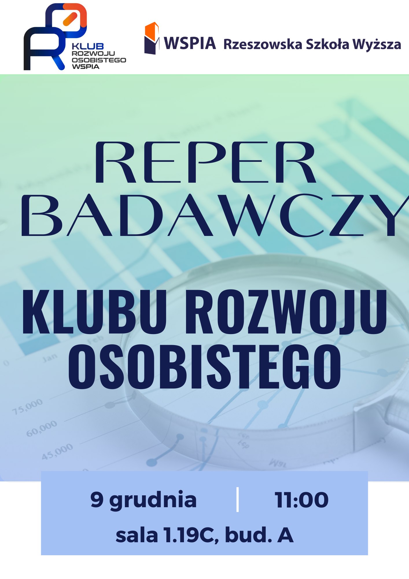 Również o godzinie 11:00 w sali 1.19 C odbędzie się kolejne spotkanie w ramach cyklu „Reper badawczy Klubu Rozwoju Osobistego”. Przypomnijmy, że w obecnym roku akademickim zespół badawczy pracuje nad koncepcją i realizacją badań dotyczących kultury studenckiej w Rzeszowie.