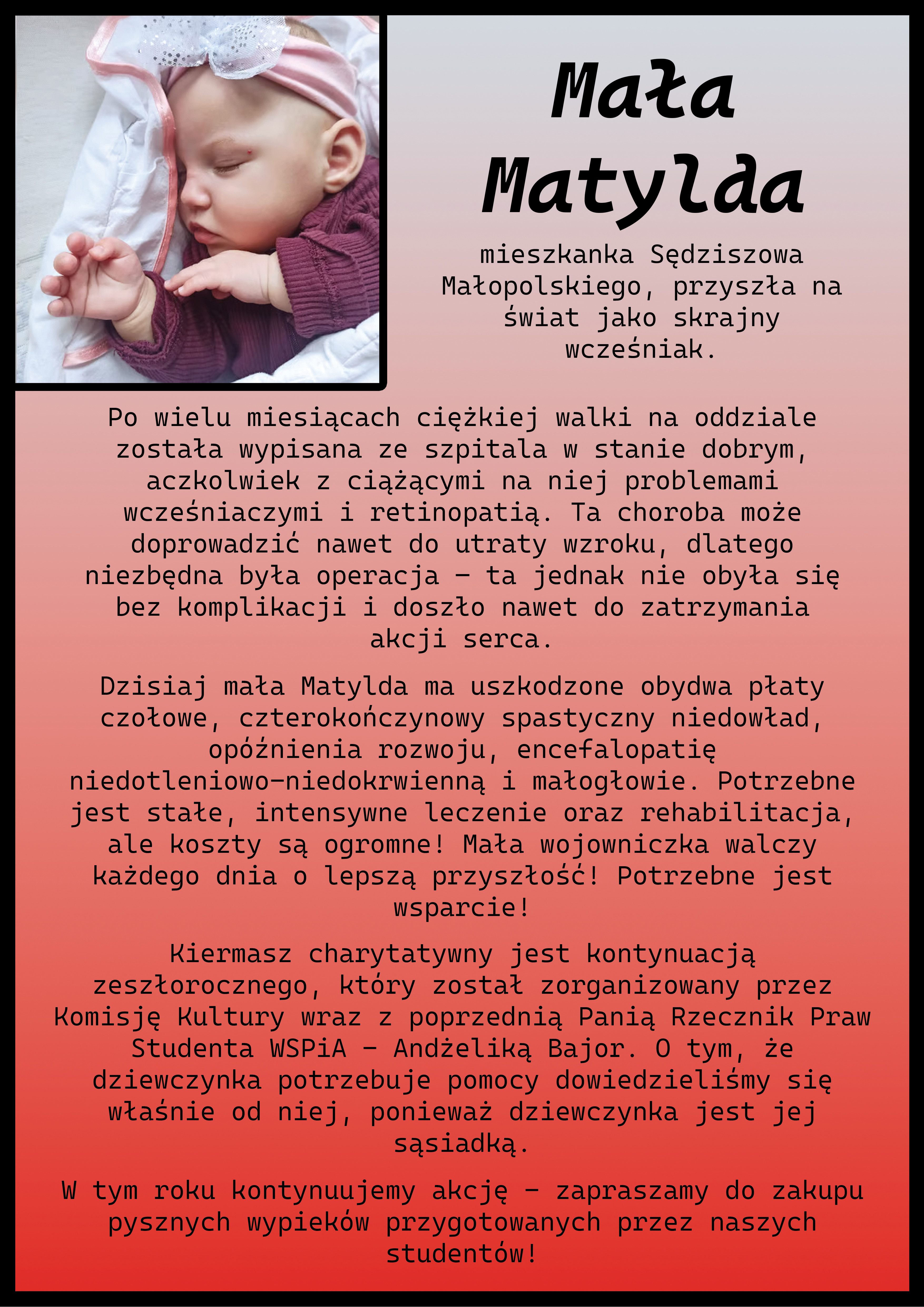 W trakcie kiermaszu będzie można zakupić domowe wypieki przygotowane przez studentów WSPiA. Całkowity dochód zostanie przekazany na dalsze leczenie i rehabilitację dziewczynki. Kiermasz charytatywny to nie tylko forma pomocy, ale również wyraz solidarności, empatii i zaangażowania społecznego studentów WSPiA. To dowód, że wspólnota akademicka naszej Uczelni nie jest obojętna wobec potrzeb innych.