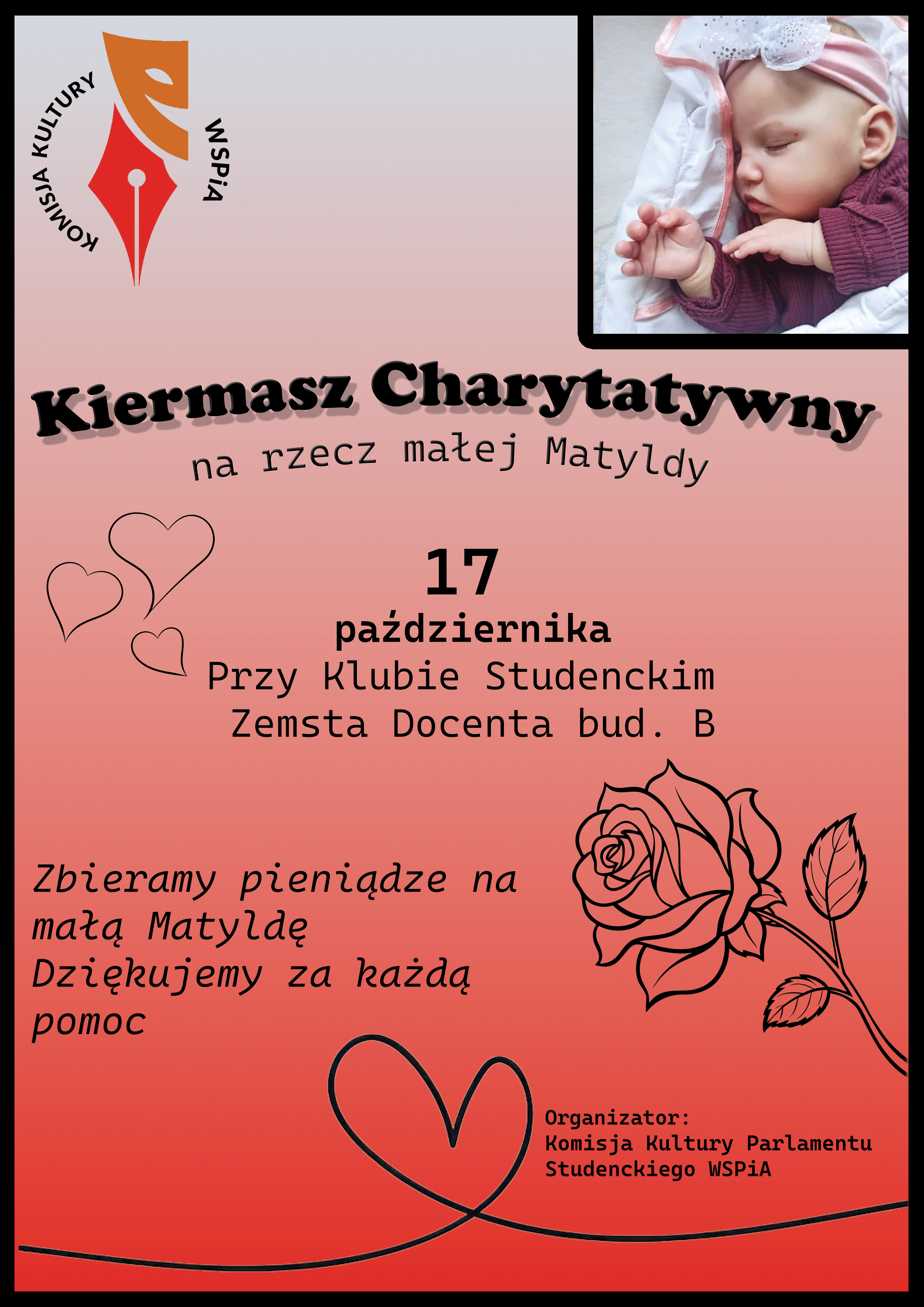 Kiermasz charytatywny dla małej Matyldy to wydarzenie towarzyszące XII edycji Podkarpackiego Młodzieżowego Święta Bezpieczeństwa w WSPiA. Tym razem Komisja Kultury Parlamentu Studentów WSPiA Rzeszowskiej Szkoły Wyższej zachęca do wsparcia leczenia i rehabilitacji małej Matyldy z Sędziszowa Małopolskiego. Kiermasz odbędzie się w piątek 17 października 2025 r. w godzinach 9:00 – 14:30.
