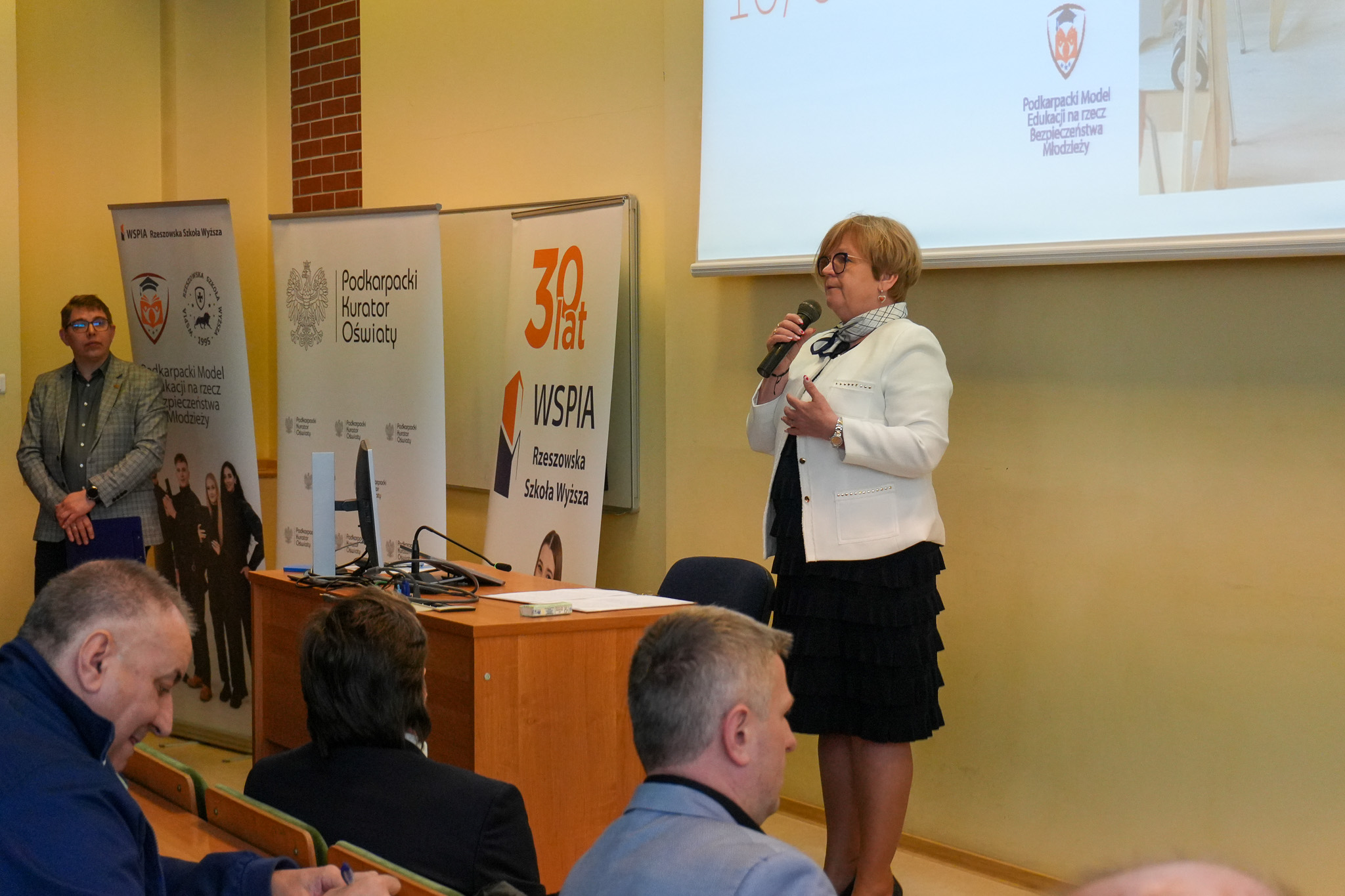Szkolenie w WSPiA było kolejnym etapem działań związanych z budowaniem systemowego podejścia do edukacji na rzecz bezpieczeństwa w szkołach województwa podkarpackiego realizowanego przez WSPiA Rzeszowską Szkołę Wyższą oraz Podkarpackie Kuratorium Oświaty pod patronatem Wojewody Podkarpackiego.