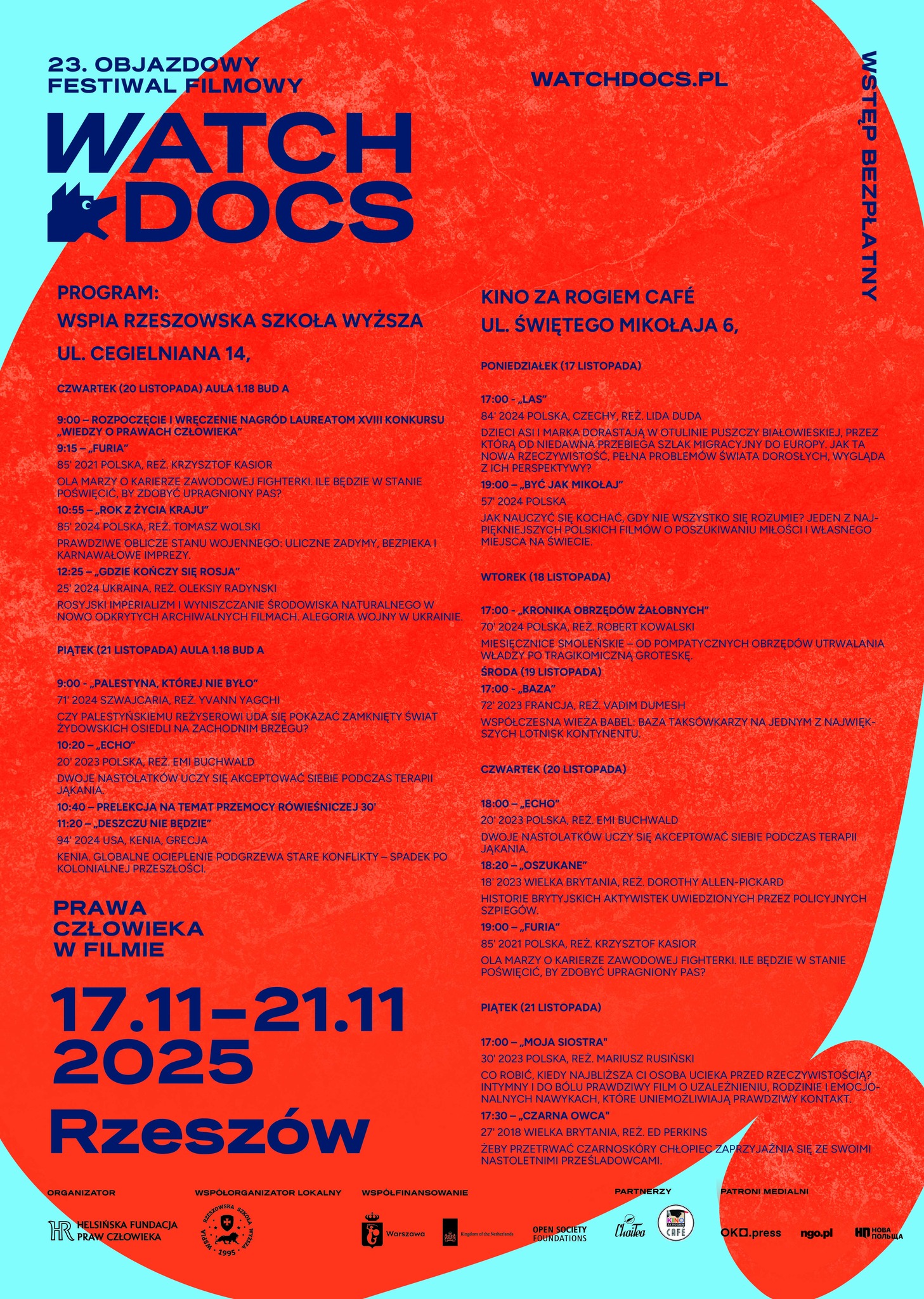 W poniedziałek 17 listopada 2025 r. wystartowała rzeszowska odsłona 23. edycja Ogólnopolskiego Objazdowego Festiwalu Filmowego „WATCH DOCS. Prawa Człowieka w Filmie”. Festiwal w stolicy województwa już po raz 18 organizuje WSPiA Rzeszowska Szkoła Wyższa. Wydarzenie potrwa od poniedziałku 17 listopada do piątku, 21 listopada 2025 r. Projekcje jak co roku zaplanowano w dwóch miejscach. Pierwsze to siedziba organizatora, czyli Kampus WSPiA Rzeszowskiej Szkoły Wyższej przy ul. Cegielnianej 14 w Rzeszowie, a drugie to Kino za Rogiem Cafe przy ul. Św. Mikołaja w Rzeszowie.