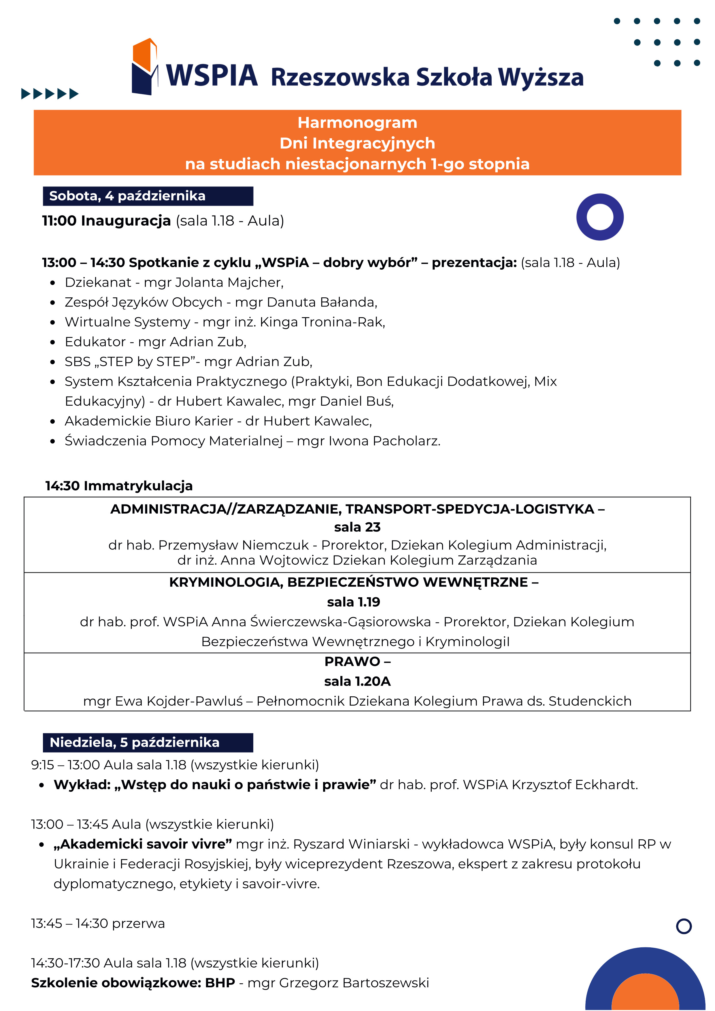 Dni integracyjne rozpoczynają się w sobotę, 4 października. Na początku nowi studenci wezmą udział w uroczystej Inauguracji Jubileuszowego Roku Akademickiego 2025/2026. Następnie będą mogli poznać nowoczesne systemy i narzędzia dydaktyczne proponowane przez WSPiA oraz Kampus WSPiA. O godzinie 14:30 udadzą się w grupach do osobnych sal, w których odbędzie się uroczysta immatrykulacja.