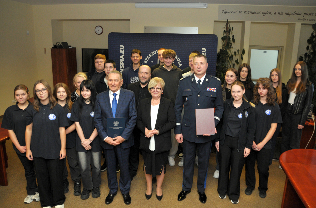 W uroczystym podpisaniu porozumienia uczestniczyli również pracowniczy WSPiA, funkcjonariusze policji oraz uczniowie klasy mundurowej z Zespół Szkół w Tyczynie i Zespół Szkół Sportowych w Rzeszowie.