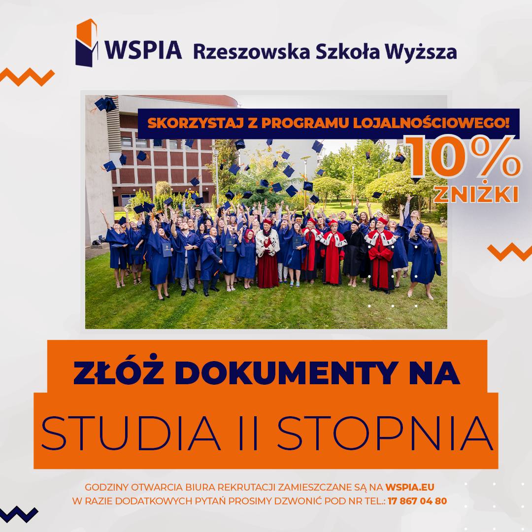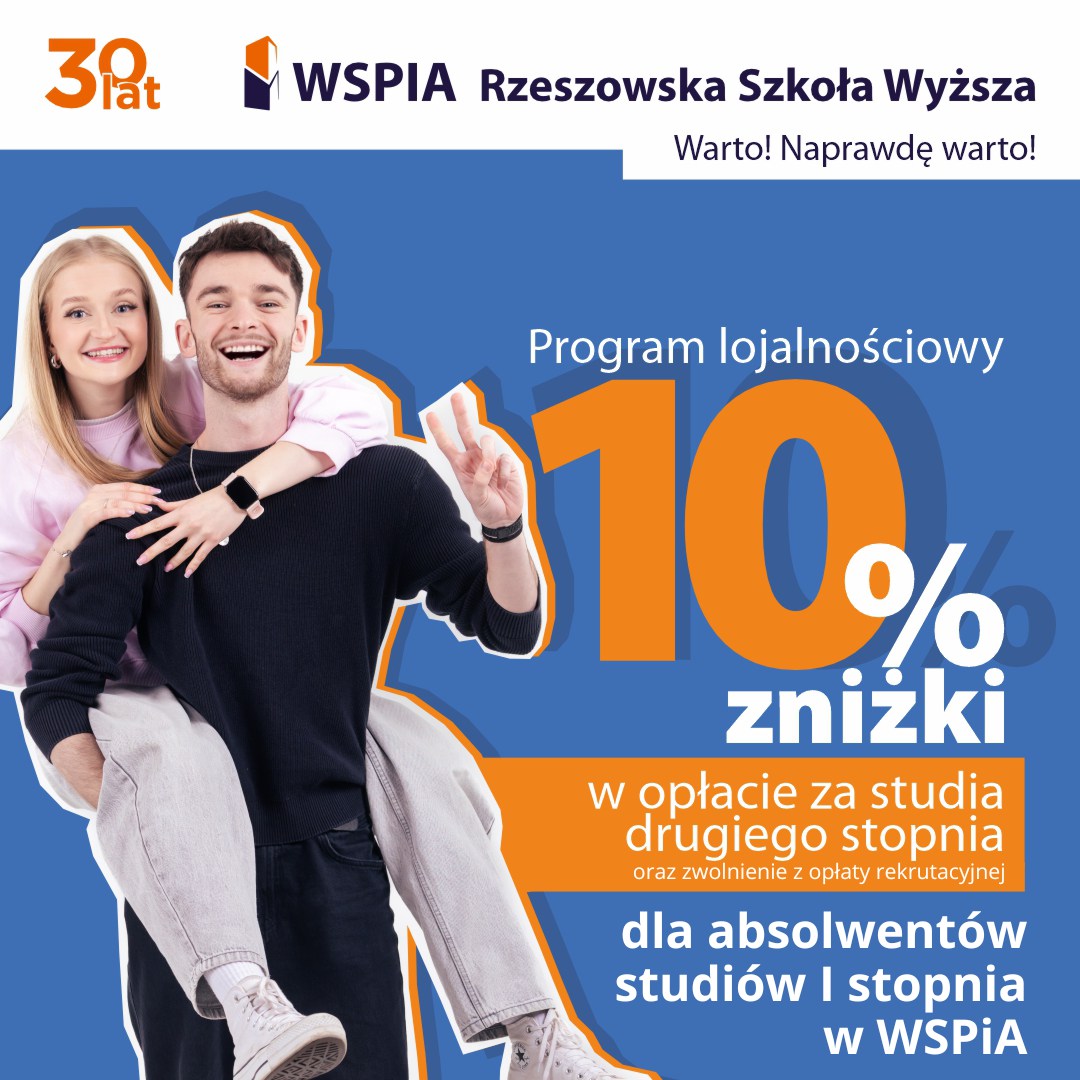 Kończysz w tym roku akademickim studia pierwszego stopnia w WSPiA i zastanawiasz się gdzie kontynuować naukę? Jeśli zdecydujesz się pozostać z nami na dłużej i wybierzesz studia II stopnia na jednym z czterech proponowanych kierunków to mamy ofertę przygotowaną specjalnie dla Ciebie! Jest to wyjątkowy program lojalnościowy. Dzięki niemu Kontynuując studia w naszej Uczelni, zyskasz m.in. 10% zniżki w opłacie za studia.